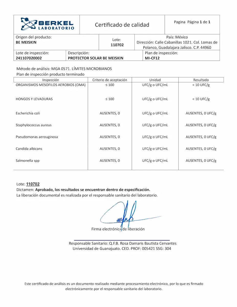 Es por ello que nuestro producto cuenta con el certificado de calidad, emitido por Laboratorio Berkel, este certificado confirma que nuestro protector cumple con los más altos estándares de calidad y seguridad microbiológica.