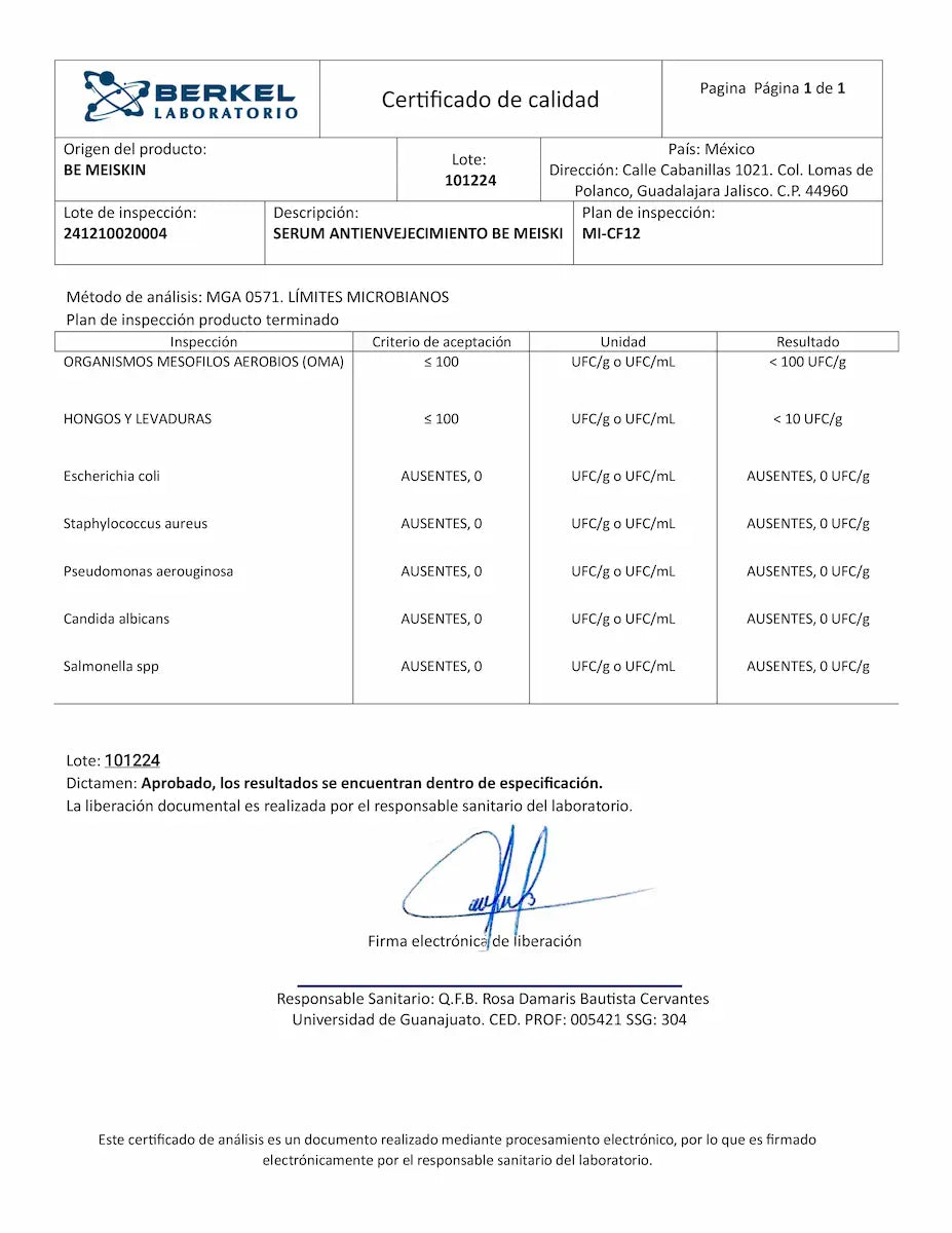 Es por ello que nuestro producto cuenta con el certificado de calidad, emitido por Laboratorio Berkel, este certificado confirma que nuestro serum cumple con los más altos estándares de calidad y seguridad microbiológica.